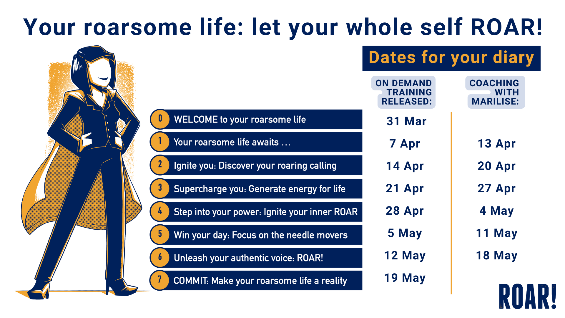 Based on Marilise's signature ROAR! Blueprint, this 6-week online course will help you make you roarsome life a reality.